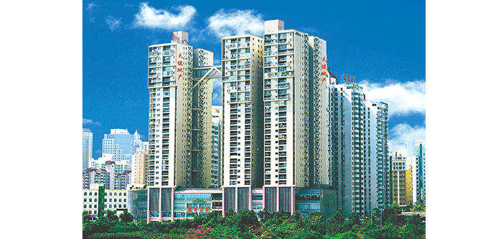 她由四層大型商業裙樓和兩棟住宅塔樓組成,樓高31層,裙樓頂有1500多平方米的屋頂花園,每隔四層設兩個空中花園,兩棟塔樓在26層由空中廊橋相連,極具現代生活氣息。