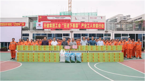 帶著集團領(lǐng)導(dǎo)的親切關(guān)懷,集團工會為工友們送來了涼茶、綠豆、白糖、書刊、文體用品、電影等,一箱箱的王老吉排成了一道靚麗的風(fēng)景線。天健集團工會副主席、黨委辦公室主任周志明,及天健一建公司領(lǐng)導(dǎo)白龍威、王欣清等來到工友們身邊,為他們派發(fā)涼茶、圖書、文體用品等,并與工友們親切交流,了解他們的工作生活情況,以及需要解決的實際困難。工會的關(guān)愛,溫暖了工友們的心田,大家一邊拎著滿滿的收獲,一邊感受著許久未見的熱鬧場面,臉上洋溢著幸福的笑容。